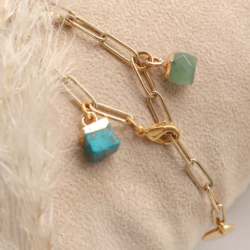 A la recherche d’exemples comment faire des bijoux avec ces pendentifs en pierre naturelle? Créez de longs colliers en fixant les pendentifs à une chaîne maille jaseron ou bien à un collier de perles en pierre naturelle que vous avez fait. Vous réalisez facilement des bracelets avec du fil élastique. Utilisez des perles en pierre naturelle que vous alternez avec des rocailles Miyuki dorées. Ou faites un bracelet breloque tendance avec une grosse chaîne maille jaseron sur laquelle vous fixez des petits ou grands pendentifs en pierre naturelle à l’aide d’un anneau brisé.
