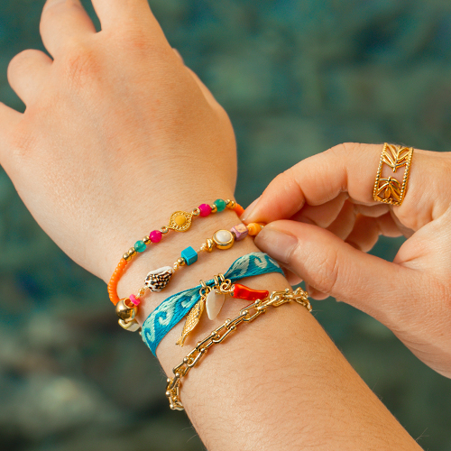 Des couleurs, des couleurs et encore des couleurs ! C’est l’essentiel de cette tendance. Plus il y a de couleurs et de matériaux, mieux c’est. Créez des bracelets et des colliers avec différentes sortes de perles comme des perles acryliques, des pierres naturelles, des perles en céramique et des perles millefiori. Réalisez des boucles d’oreilles assorties en enfilant les mêmes perles sur des créoles. Combinez des bagues prêtes-à-porter avec des bagues que vous créez avec du fil élastique et des perles de rocailles pour un look fantastique !