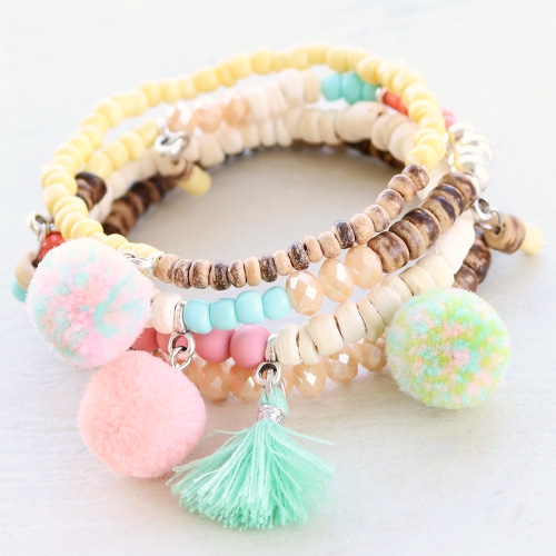 Ambiance des Caraïbes avec des perles en coco ! A combiner avec des perles de rocailles colorées et des pendentifs ou pompons pour faire un ensemble tout à fait dans le style caribéen. Les bracelets sont fait de cordon élastique avec des perles en coco complétées par quelques perles de rocailles en verre et des perles à facettes. Entre les perles, nous avons rajouté des pendentifs et pompons. En plus, nous avons confectionné quelques pendentifs nous-mêmes composés des perles en coco et des rocailles montées sur un clou à tête plate.
