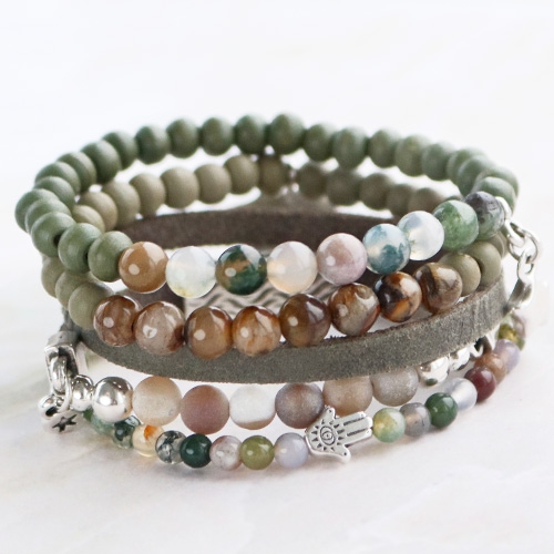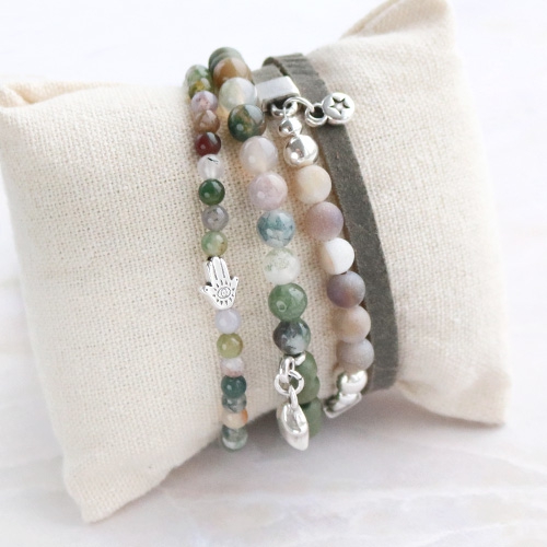 Vous cherchez l'inspiration pour faire des bijoux avec notre nouvelle collection de perles en pierre naturelle ? Alors découvrez vite nos créations de bracelets ! Nous avons combiné les perles en pierre naturelle avec du cuir DQ en utilisant des embouts entre lesquels les perles en pierre naturelle sont enfilées. Voilà un bracelet tout à fait naturel ! Vous pouvez également ajouter des breloques subtiles en métal DQ pour rendre l'ensemble plus ludique. Enfin, nous avons utilisé des perles en bois pour contraster avec les perles en pierre naturelle brillante. Pour l’enfilage des perles, nous avons utilisé du fil élastique. Finissez votre création avec un de nos fermoirs aimantés de notre collection.