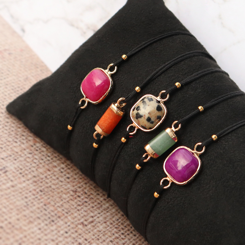 Vous cherchez de l’inspiration pour votre nouvelle collection ? Alors ne manquez pas de découvrir ces bijoux inspirés des pierres naturelles ! Cette fois-ci, nous avons travaillé avec nos superbes nouveaux pendentifs et connecteurs en pierre naturelle. Avec ces articles de premier choix, vous pouvez fabriquer des bijoux élégants, comme des boucles d’oreilles, en un rien de temps. Vous pouvez choisir de laisser briller le pendentif en pierre naturelle et de simplement attacher un pendentif à une partie de la boucle d’oreille. Vous aimez les boucles d’oreilles qui attirent l’attention ? Combinez alors un insert en pierre naturelle à une breloque en pierre naturelle ou un pendentif bohème. Pour ce faire, il faut les accrocher ensemble. Grâce aux magnifiques nuances, cette association forme un ensemble et présente un effet fun et unique. Vous voulez fabriquer des bracelets assortis ? Alors nouez un bracelet avec du fil macramé avec une pierre naturelle au milieu. Bonne chance !