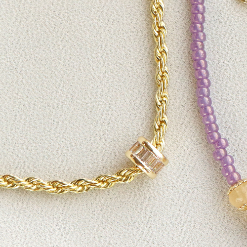 Ces petites breloques en zirconium sont superbes sur un collier en chaîne maille jaseron que vous pouvez utiliser comme collier ou comme chaîne de corps. Réalisez plusieurs colliers que vous pourrez porter ensemble, car ‘layering’ est toujours la tendance ! Créez par exemple un collier avec des pierres naturelles facettées et une perle en zirconium au milieu. Pour maintenir cette perle en place et cacher le trou d’enfilage, vous pouvez utiliser un embout de la collection bijoux C.U.S® message beads.
