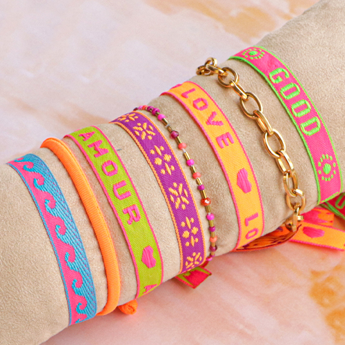 Avec ce ruban texte aux couleurs néon, vous pouvez facilement créer une collection de bracelets super tendance. Choisissez le ruban que vous voulez utiliser et coupez-le à la bonne longueur. Il y a plusieurs façons pour fermer les bracelets; en vous servant d’une perle stoppeur ou bien d’une perle lettre acrylique. En utilisant une perle lettre; vous pouvez ajouter une touche personnelle à votre bracelet !