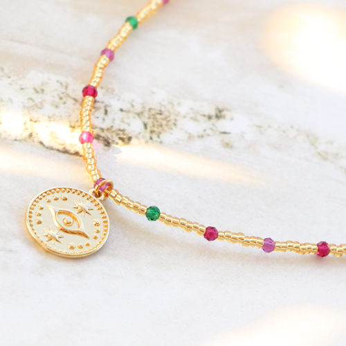 Besoin d’inspiration pour réaliser des bijoux tendance avec l’œil porte-bonheur ? Alors vous êtes à la bonne adresse ! Nous avons déjà commencé à travailler avec la gamme et réalisé un certain nombre d’articles contemporains. Confectionnez par exemple un élégant collier en jaseron et accrochez-y votre breloque préférée avec l’œil porte-bonheur / l’œil omniscient. Vous pouvez bien entendu également confectionner des boucles d’oreilles minimalistes et branchées avec ces breloques. Choisissez d’abord un de nos supports boucle d’oreille ou une créole et attachez-y ensuite la breloque « œil porte-bonheur / œil omniscient ». Vous voulez donner plus de couleur à l’ensemble ? Alors, vous pouvez également enfiler des perles de rocailles, des perles à facettes et des perles en métal DQ sur le collier. Utilisez un pendentif avec un œil pour y attacher une breloque.