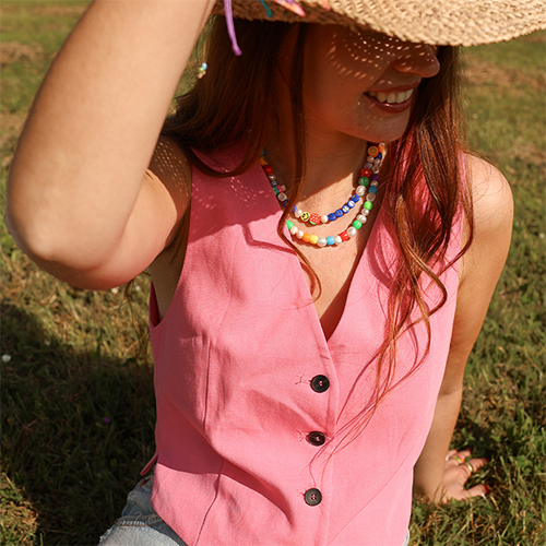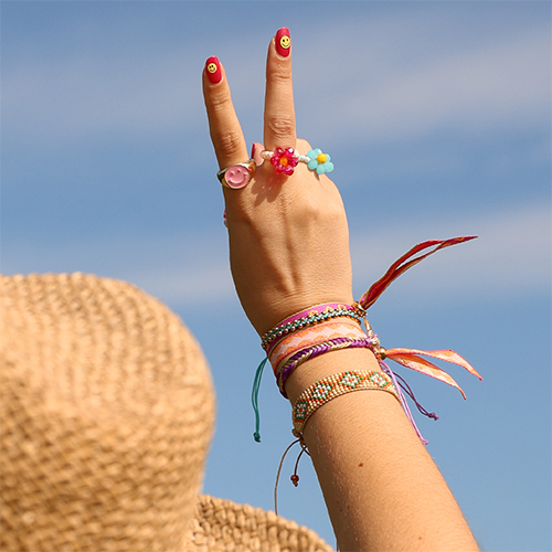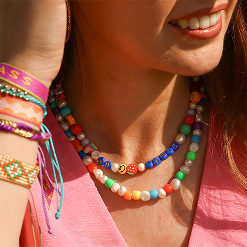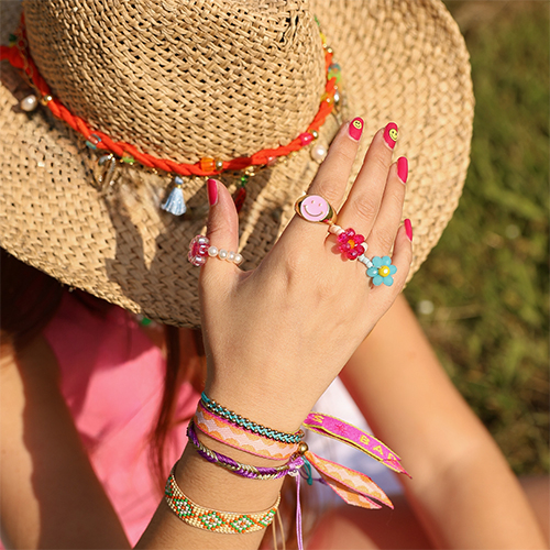Laissez-vous inspirer et découvrez les incontournables du festival ! Colliers avec perles en acrylique (lettres), colliers prêts à porter, petits fruits en polymère et smileys en céramique sont totalement in. Pour les accessoires de chapeau, choisissez du ruban élastique, des perles acryliques, du jaseron, des pompons, des perles et des breloques en forme de fruits. Les bracelets avec les rubans à texte ou les bracelets tissés prêts à l'emploi sont très tendance.