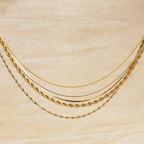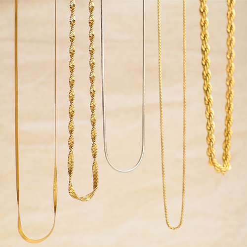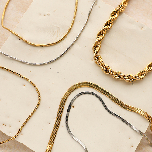 Découvrez le charme de notre nouvelle collection de colliers et bracelets en acier inoxydable. Disponible dans diverses variantes élégantes comme rondes et torsadées. Parfait à combiner ou à assortir avec vos autres bijoux pour une magnifique collection de printemps.