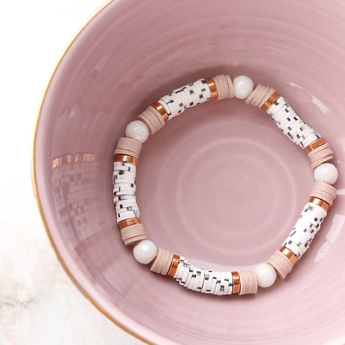 Impossible de nier que les perles Katsuki sont des articles résolument tendance. Mais que pouvez-vous réaliser avec ces perles sympas style heishi ? Nous vous guidons dans la réalisation de ces bijoux d'inspiration. Vous pouvez par exemple réaliser des bracelets avec les nouvelles perles Katsuki combinées avec des perles disques en pierre naturelle et des perles et breloques DQ. Pour une note fun supplémentaire, vous pouvez également utiliser un anneau brisé pour accrocher vos breloques DQ préférées ou un embout pompon sur le bracelet. Vous voulez réaliser un ensemble complet ? Vous pouvez créer un jeu assorti de boucles d'oreilles en enfilant les perles Katsuki sur un support boucles d'oreilles ou une créole. Là encore, vous pouvez parfaitement combiner les perles en pierre naturelle et les perles DQ. Bon, il est temps de commencer ! Amusez-vous bien !